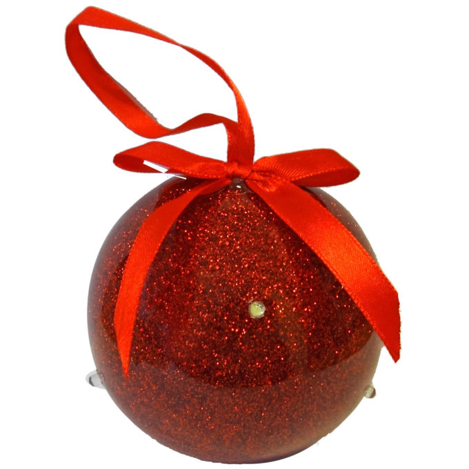 Boule de Noël scintillante à leds, se recharge à l’aide d’une pile jetable.