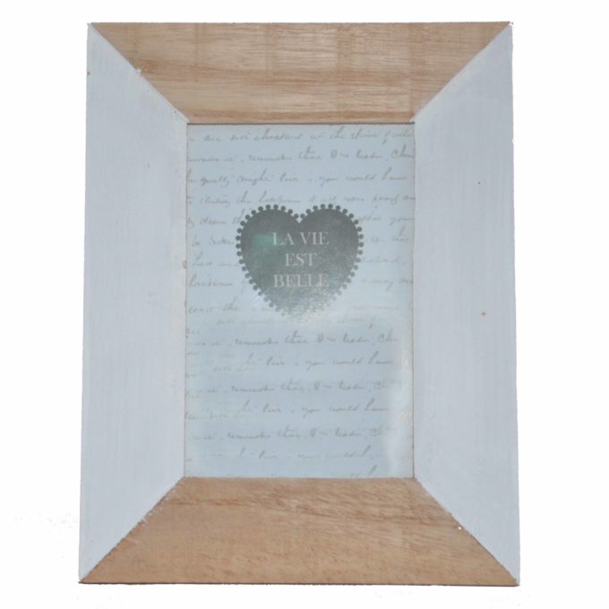 Cadre Photo 10×15 bois naturel / blanc, s’accroche au mur ou peut se poser sur un meuble grâce à son pied.