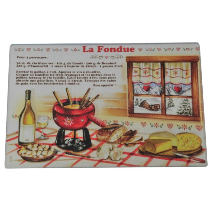 Planche à découper multi-usages avec la recette de la fondue, planche en verre trempé, résiste à des températures jusqu’à 280°c. Cette planche à découper avec la recette de la fondue est parfaite pour découper vos légumes en tranches, idéal pour la pâtisserie et peut également servir comme planche à fromages.